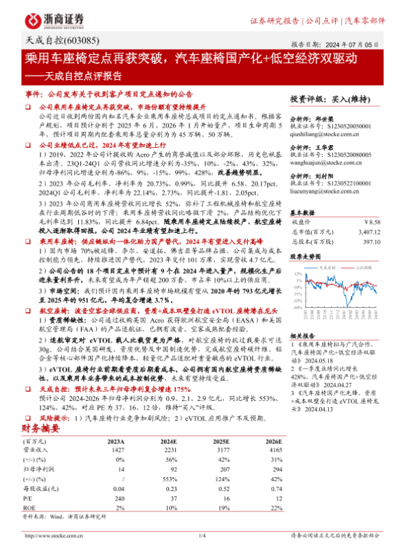 【浙商证券】【20240705】2024年08月01日更新-乘用车座椅定点再获突破,汽车座椅国产化+低空经济双驱动-4页 行业研究