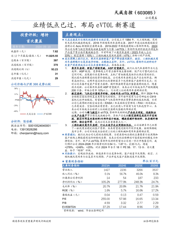 【华安证券】【20240919】天成自控(603085)业绩低点已过,布局eVTOL新赛道-26页 行业研究