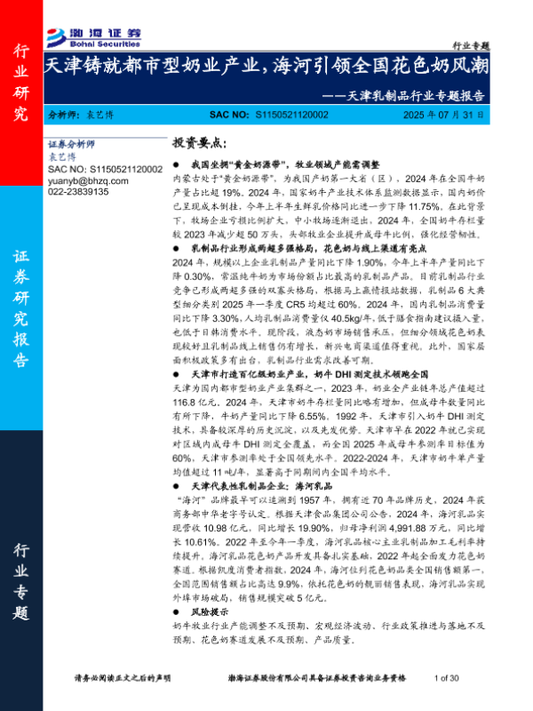 【渤海证券】【202507】天津铸就都市型奶业产业,海河引领全国花色奶风潮-30页 行业研究