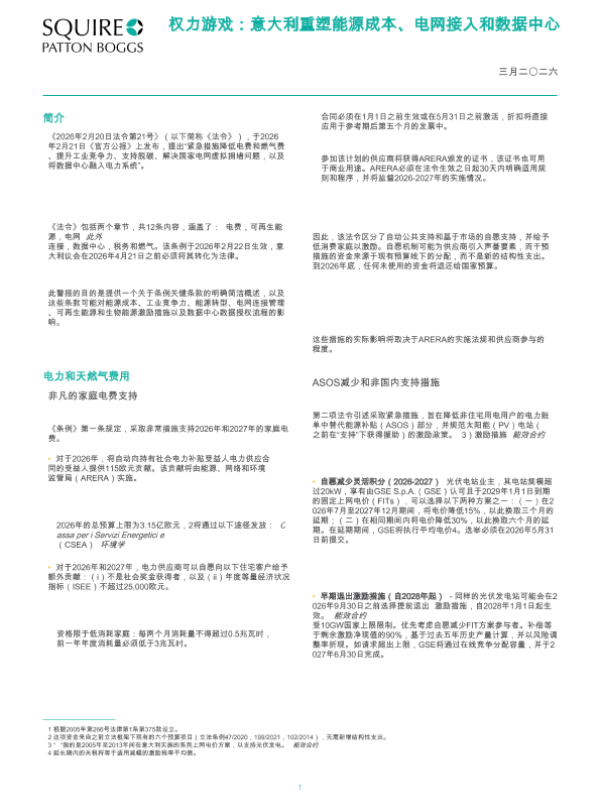【PATTON BOGGS】【202603】权力游戏:意大利重塑能源成本、电网接入和数据中心-6页 政策文件