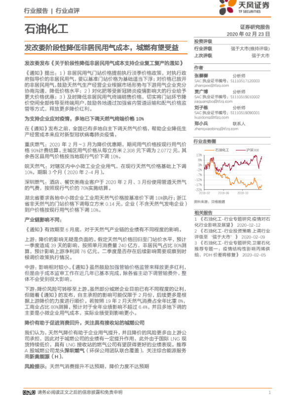 【天风证券】【20200223】石油化工行业点评:发改委阶段性降低非居民用气成本,城燃有望受益-2页 行业研究