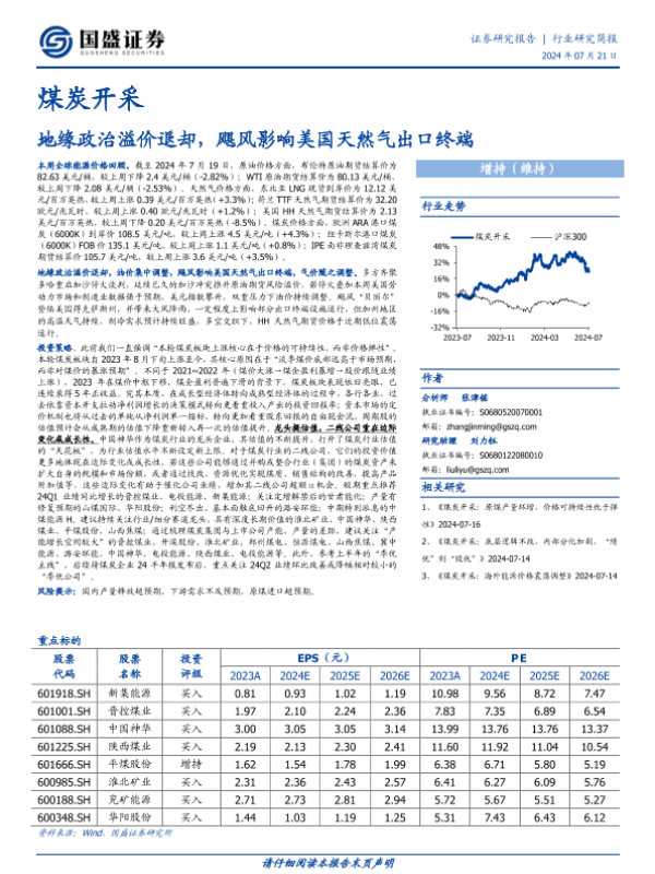 【国盛证券】【20240721】煤炭开采:地缘政治溢价退却,飓风影响美国天然气出口终端-12页 行业研究
