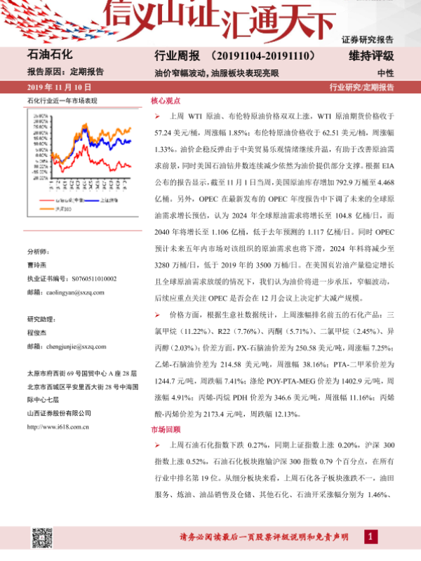 【山西证券】【20191110】石油石化行业周报:油价窄幅波动,油服板块表现亮眼-14页 行业研究
