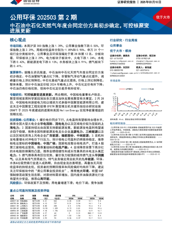 【国信证券】【20250310】公用环保202503第2期:中石油中石化天然气年度合同定价方案初步确定,可控核聚变进展更新-30页 行业研究