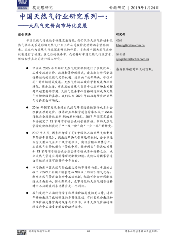 【莫尼塔研究】【20190124】中国天然气行业研究系列一:天然气定价向市场化发展-13页 行业研究