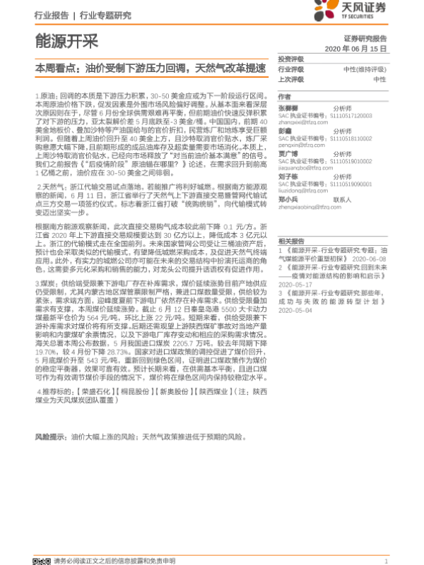 【天风证券】【20200615】能源开采本周看点:油价受制下游压力回调,天然气改革提速-2页 行业研究