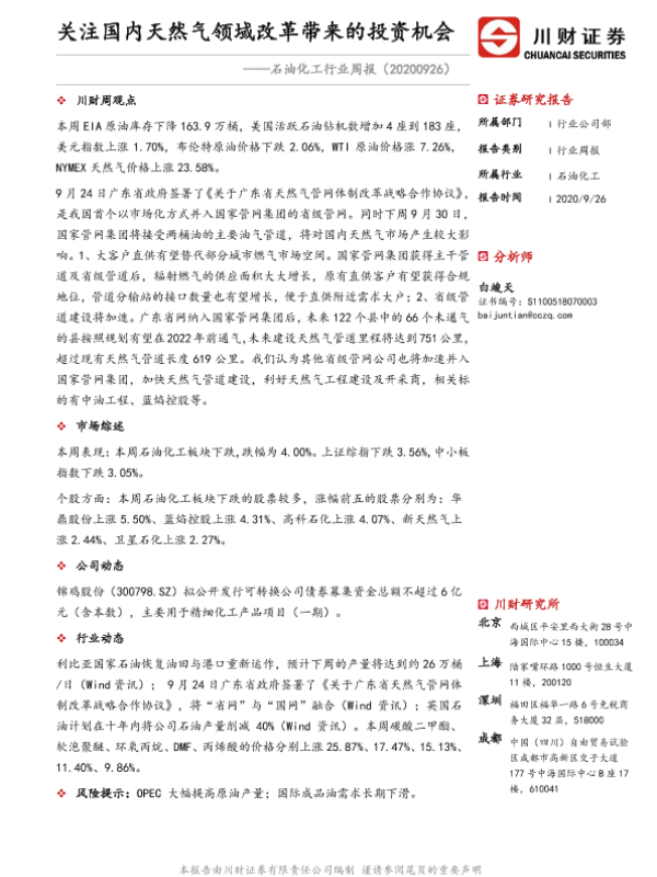 【川财证券】【20200926】20200926-川财证券-石油化工行业周报:关注国内天然气领域改革带来的投资机会-12页 行业研究