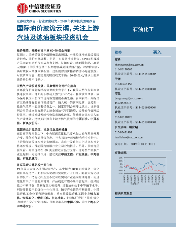 【中信建投证券】【20190830】石油化工行业2019年秋季投资策略报告:国际油价波诡云谲,关注上游汽油及炼油板块投资机会-51页 行业研究