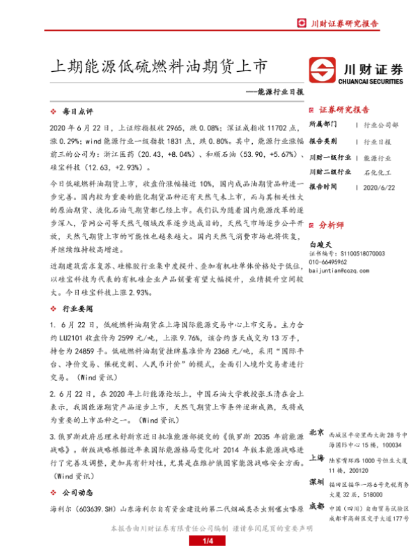 【川财证券】【20200622】能源行业日报:上期能源低硫燃料油期货上市-4页 证券期货研究报告