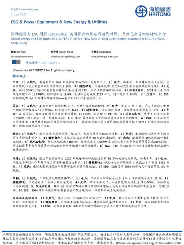 【海通国际】【20240606】国际能源与ESG周报(5/27-6/02) 美国推出加快电网建设新规,天然气期货价格持续上行-42页 行业研究