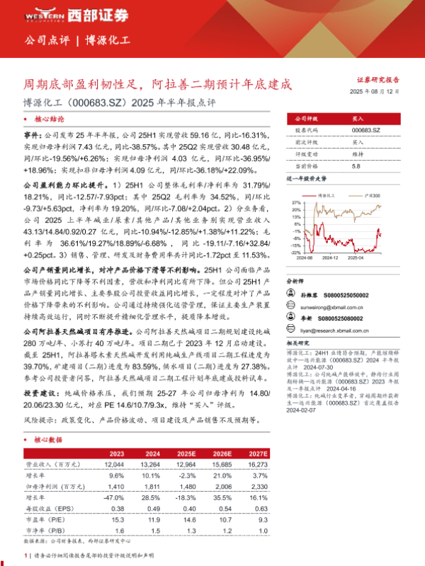 【西部证券】【20250812】博源化工2025年半年报点评:周期底部盈利韧性足,阿拉善二期预计年底建成-3页 证券期货研究报告