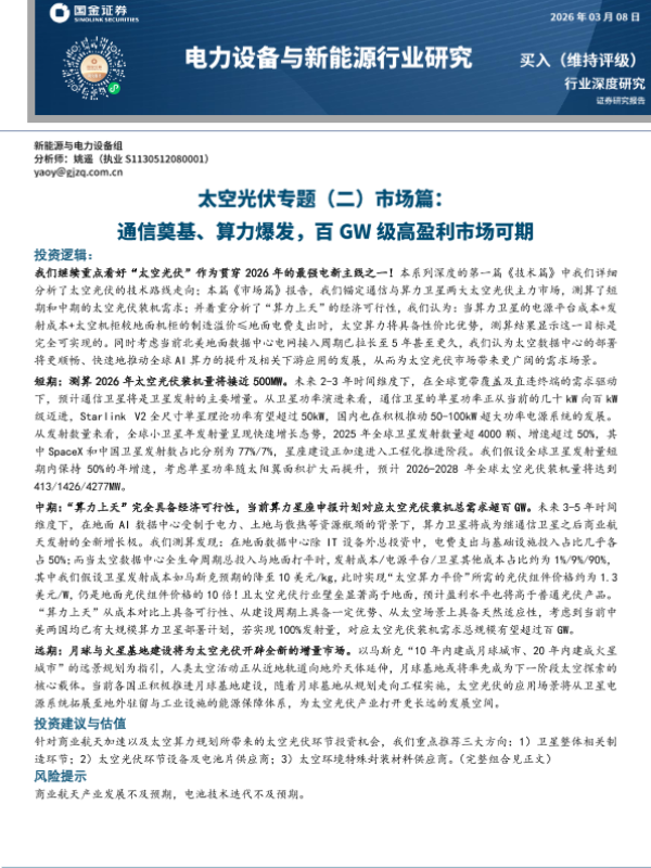 【国金证券】【202603】太空光伏专题(二)市场篇:通信奠基、算力爆发,百GW级高盈利市场可期-24页 证券期货研究报告