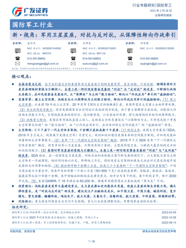 【广发证券】【20230328】国防军工行业:新·视角:军用卫星星座,对抗与反对抗,从保障性转向作战牵引-35页 行业研究