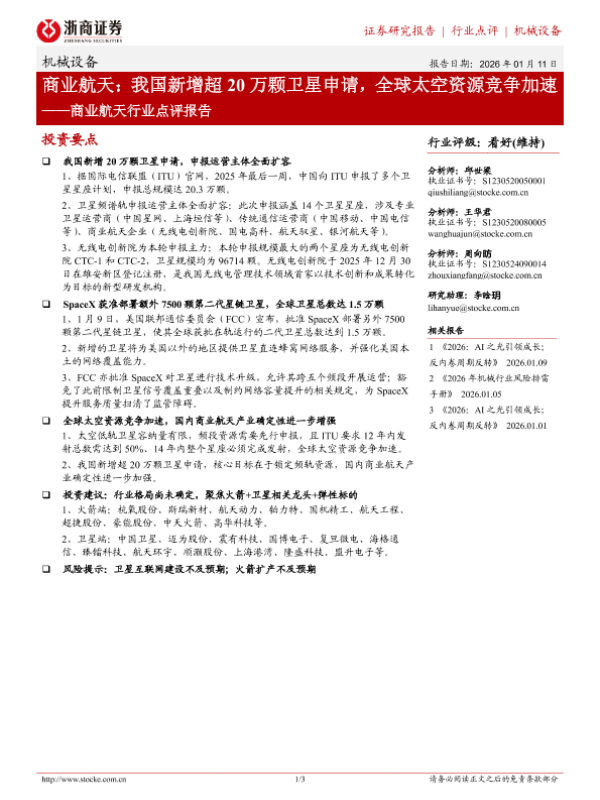 【浙商证券】【202601】商业航天:我国新增超 20万颗卫星申请,全球太空资源竞争加速——商业航天行业点评报告-3页 证券期货研究报告