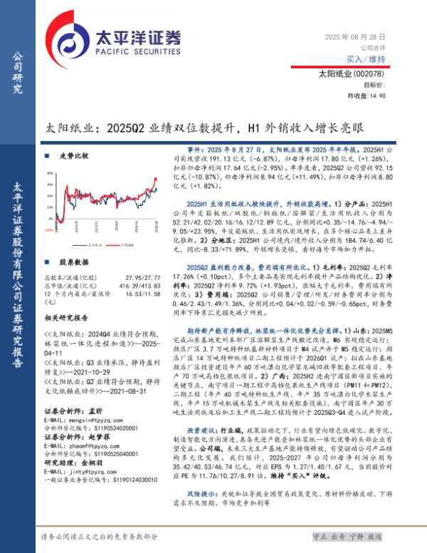 【太平洋证券】【20250828】太阳纸业-2025Q2业绩双位数提升,H1外销收入增长亮眼-5页 证券期货研究报告