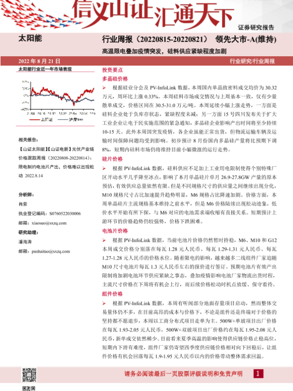 【山西证券】【20220821】太阳能行业周报:高温限电叠加疫情突发,硅料供应紧缺程度加剧-4页 行业研究