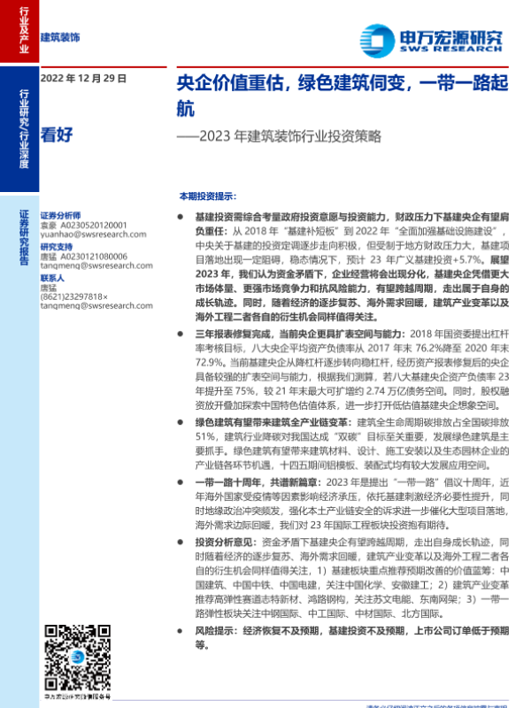【申万宏源】【20221229】2023年建筑装饰行业投资策略:央企价值重估,绿色建筑伺变,一带一路起航-40页 行业研究