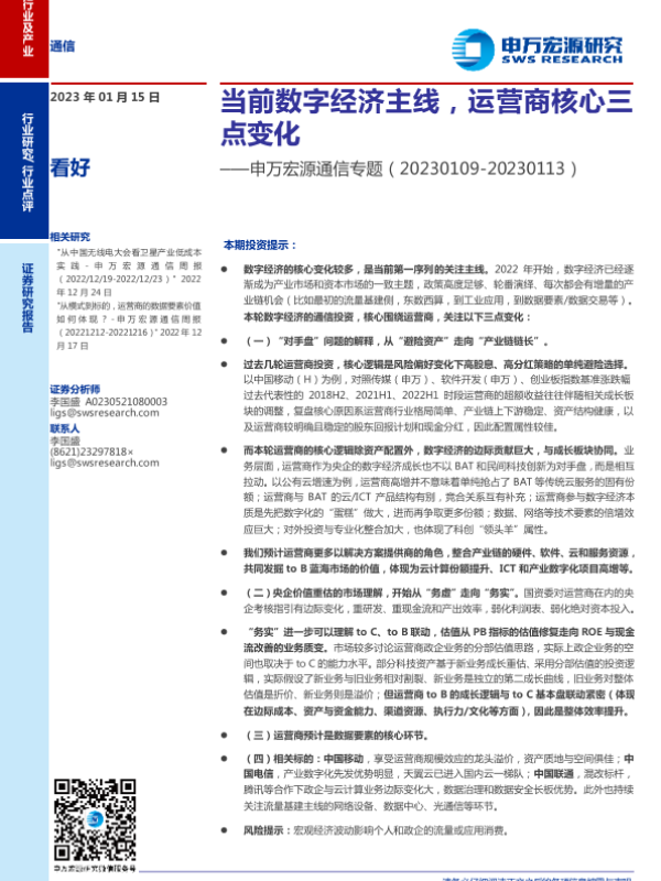 【申万宏源】【20230115】通信行业专题:当前数字经济主线,运营商核心三点变化-15页 行业研究