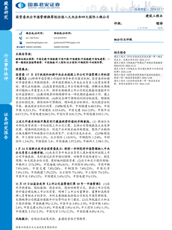 【国泰君安证券】【20241217】建筑工程行业:国资委央企市值管理推荐低估值八大央企和四大国际工程公司-19页 行业研究
