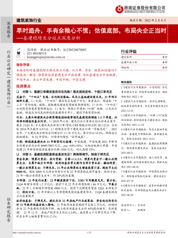 【浙商证券】【20220209】建筑装饰行业基建稳增长分歧点深度分析:旱时造舟,手有余粮心不慌;估值底部,布局央企正当时-23页 行业研究