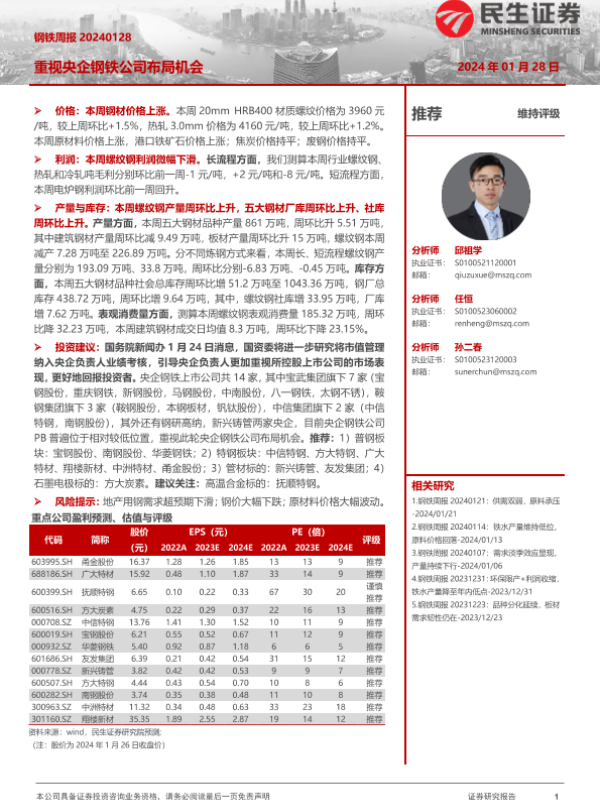 【民生证券】【20240128】20240128-民生证券-钢铁周报:重视央企钢铁公司布局机会-20页 行业研究