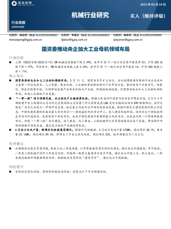【光大证券】【20230514】机械行业周报2023年第19周:国资委要求央企加大新兴产业布局,半导体设备国产替代加速推进-21页 行业研究