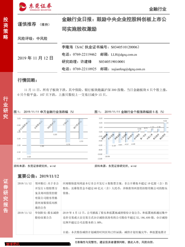 【东莞证券】【20191112】金融行业日报:鼓励中央企业控股科创板上市公司实施股权激励-4页 行业研究