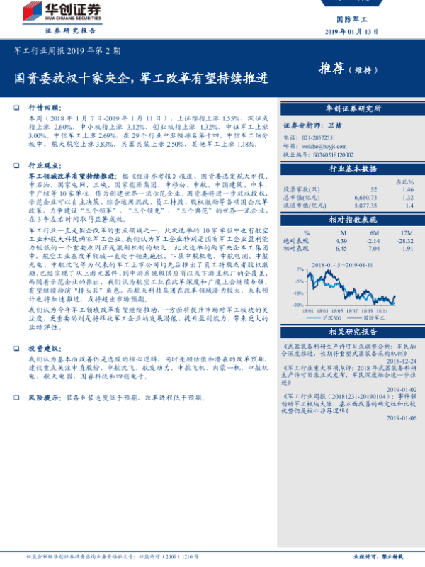 【华创证券】【20190113】军工行业周报2019年第2期:国资委放权十家央企,军工改革有望持续推进-11页 行业研究
