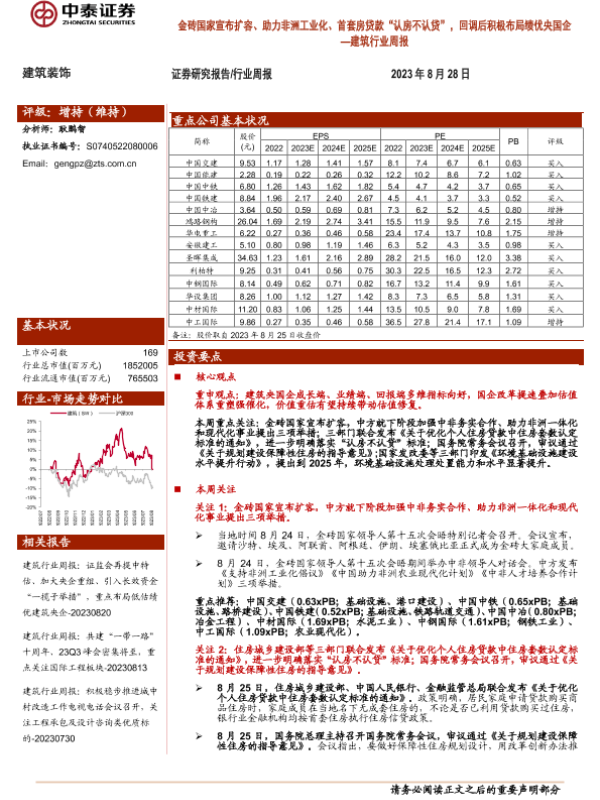 【中泰证券】【20230828】建筑行业周报:金砖国家宣布扩容、助力非洲工业化、首套房贷款“认房不认贷”,回调后积极布局绩优央国企-17页 行业研究