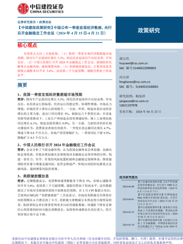 【中信建投证券】【20240423】中国公布一季度宏观经济数据,央行召开金融稳定工作会议-16页 行业研究