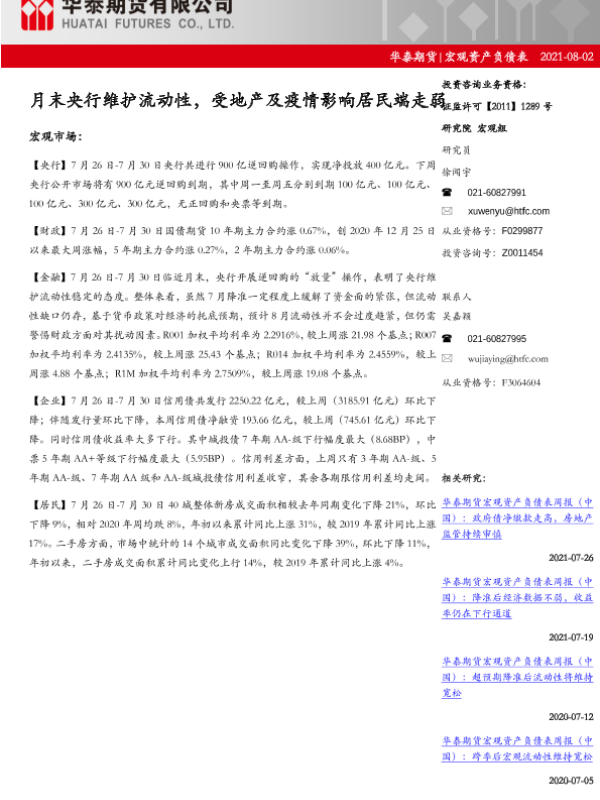 【华泰期货】【20210802】宏观资产负债表:月末央行维护流动性,受地产及疫情影响居民端走弱-16页 行业研究