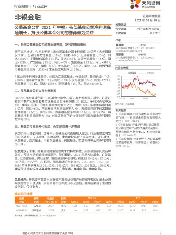 【天风证券】【20210830】公募基金公司2021年中报:头部基金公司净利润高速增长,持股公募基金公司的券商最为受益-5页 行业研究