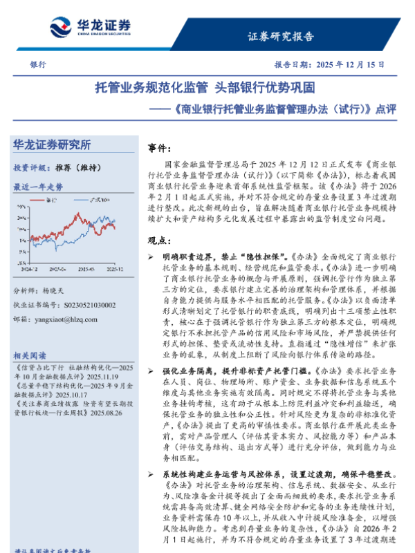 【华龙证券】【202512】托管业务规范化监管头部银行优势巩固——《商业银行托管业务监督管理办法(试行)》点评-3页 证券期货研究报告