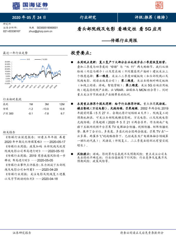 【国海证券】【20200524】20200524-国海证券-传媒行业周报:看头部院线及电影 看确定性 看5G应用-17页 行业研究