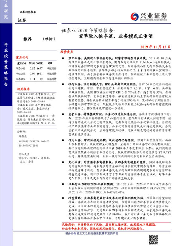 【兴业证券】【20191112】证券业2020年投资策略报告:变革驶入快车道,业务模式正重塑-22页 行业研究