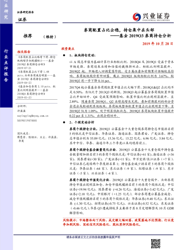 【兴业证券】【20191028】基金2019Q3券商持仓分析:券商配置占比企稳,持仓集中在头部-6页 行业研究