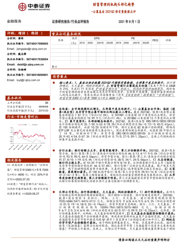 【中泰证券】【20210801】公募基金2021Q2保有量数据点评:财富管理的机构头部化趋势-5页 行业研究