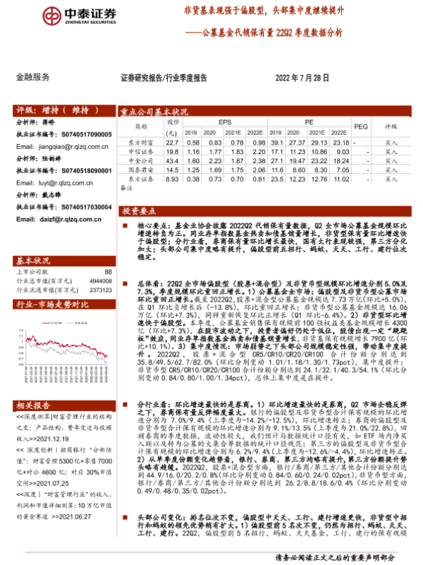 【中泰证券】【20220728】公募基金代销保有量22Q2季度数据分析:非货基表现强于偏股型,头部集中度继续提升-13页 行业研究