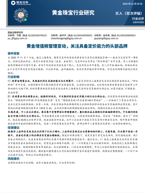 【国金证券】【2025】黄金珠宝行业研究:黄金增值税管理变动,关注具备定价能力的头部品牌-3页 证券期货研究报告