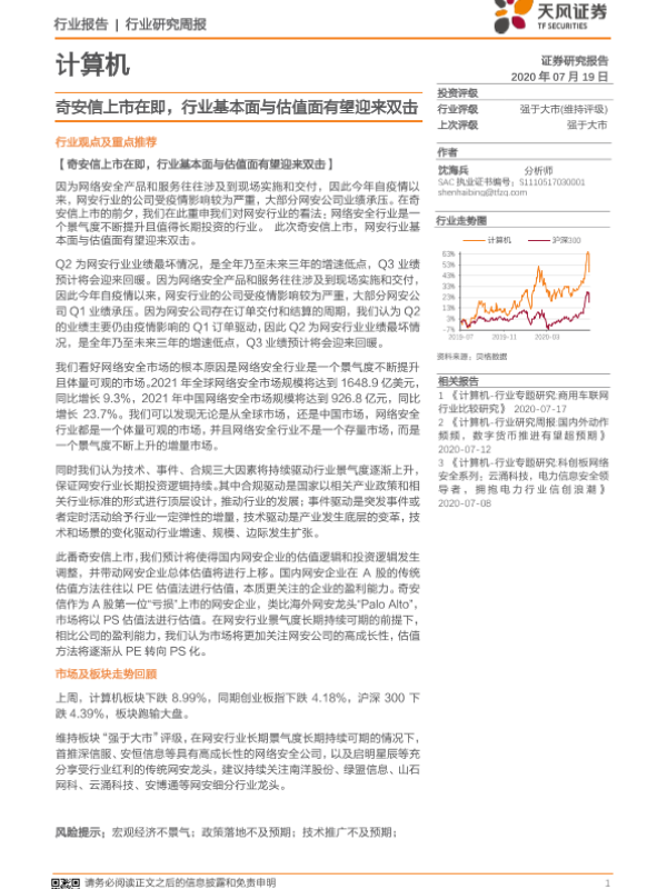【天风证券】【20200719】20200719-天风证券-计算机行业研究周报:奇安信上市在即,行业基本面与估值面有望迎来双击-10页 行业研究