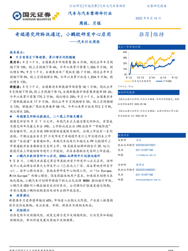 【国元证券】【202509】奇瑞港交所聆讯通过,小鹏欧研发中心启用——汽车行业周报-14页 行业研究
