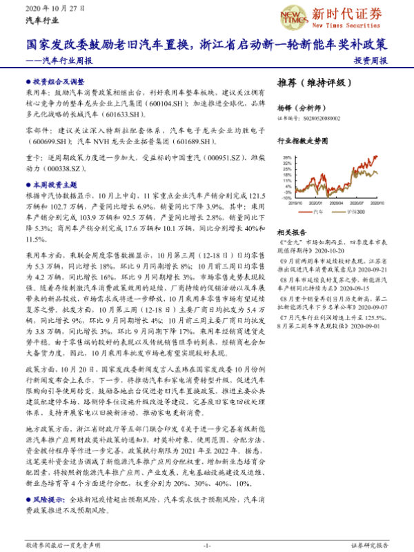 【新时代证券】【20201027】新时代证券-汽车行业周报:国家发改委鼓励老旧汽车置换,浙江省启动新一轮新能车奖补政策-19页 行业研究