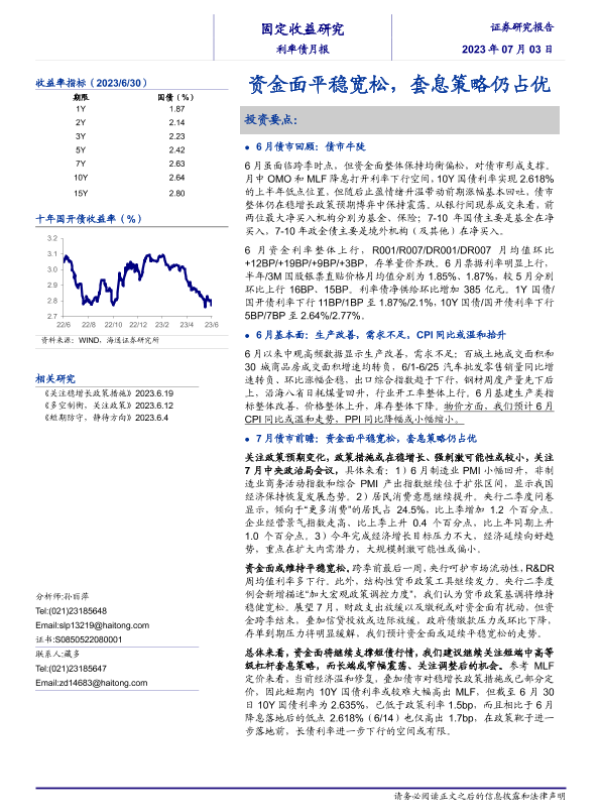 【海通证券】【20230703】利率债月报:资金面平稳宽松,套息策略仍占优-21页 行业研究