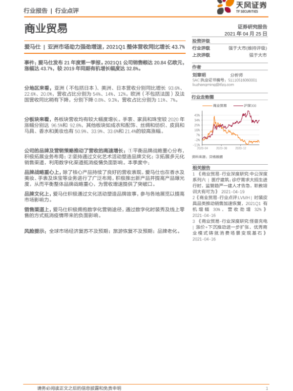 【天风证券】【20210425】爱马仕 亚洲市场助力强劲增速,2021Q1整体营收同比增长43.7%-5页 行业研究