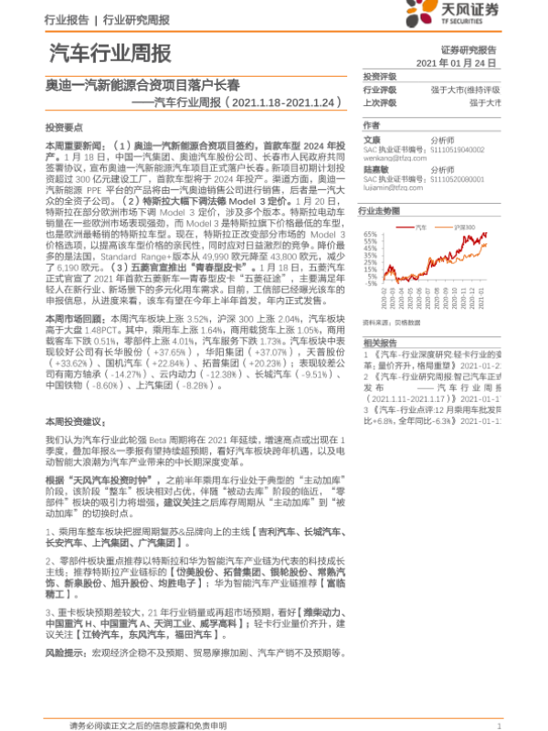【天风证券】【20210124】20210124-天风证券-汽车行业周报:奥迪一汽新能源合资项目落户长春-13页 行业研究