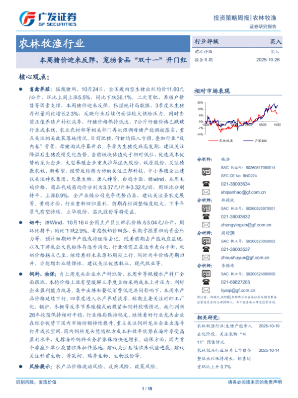 【广发证券】【202510】农林牧渔行业:本周猪价迎来反弹,宠物食品“双十一”开门红-18页 证券期货研究报告
