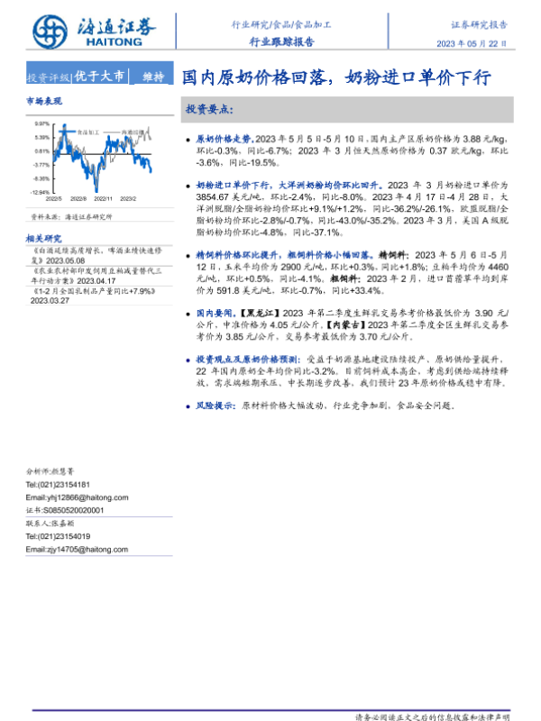 【海通证券】【20230522】20230522-海通证券-食品加工行业跟踪报告:国内原奶价格回落,奶粉进口单价下行-10页 行业研究