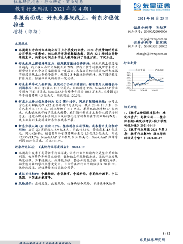 【东吴证券】【20210123】教育行业周报(2021年第4期):季报面面观:好未来鏖战线上,新东方稳健推进-12页 行业研究