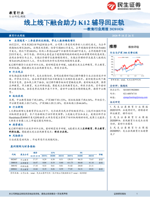 【民生证券】【20201026】教育行业周报:线上线下融合助力K12辅导回正轨-11页 行业研究