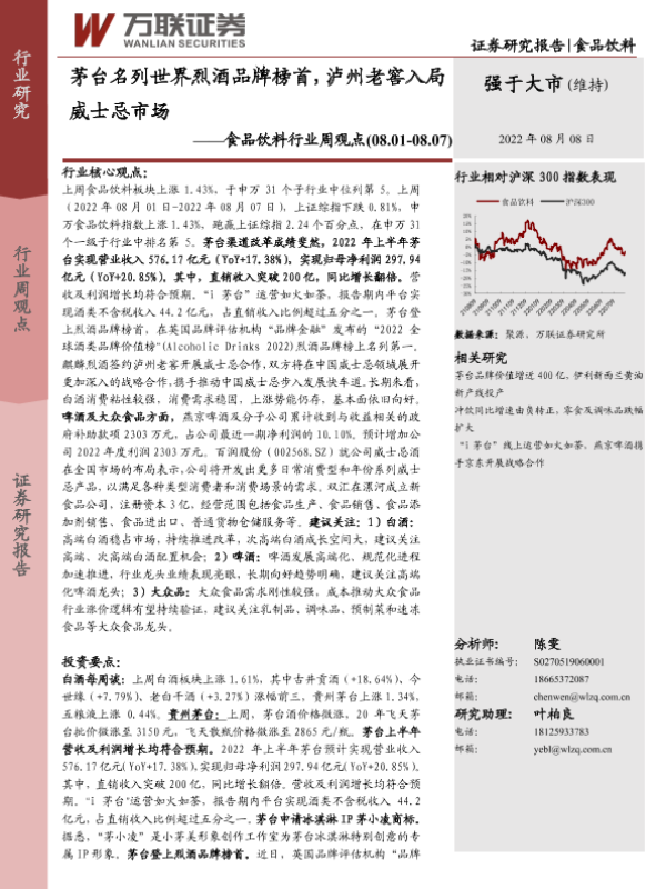 【万联证券】【20220808】20220808-万联证券-食品饮料行业周观点:茅台名列世界烈酒品牌榜首,泸州老窖入局威士忌市场-11页 行业研究